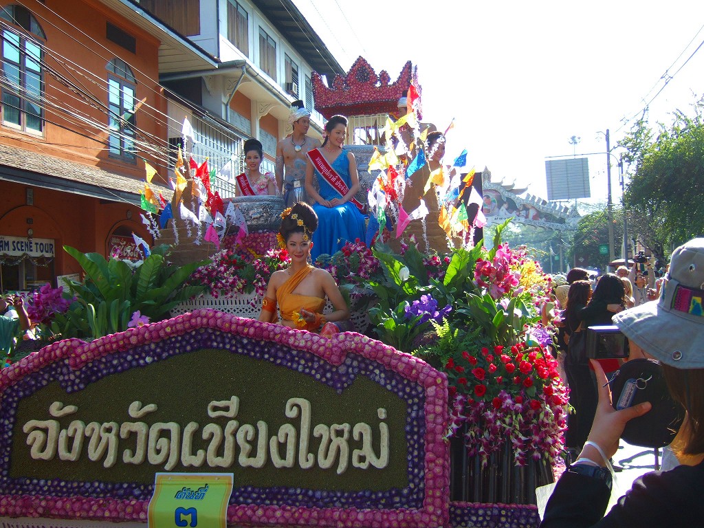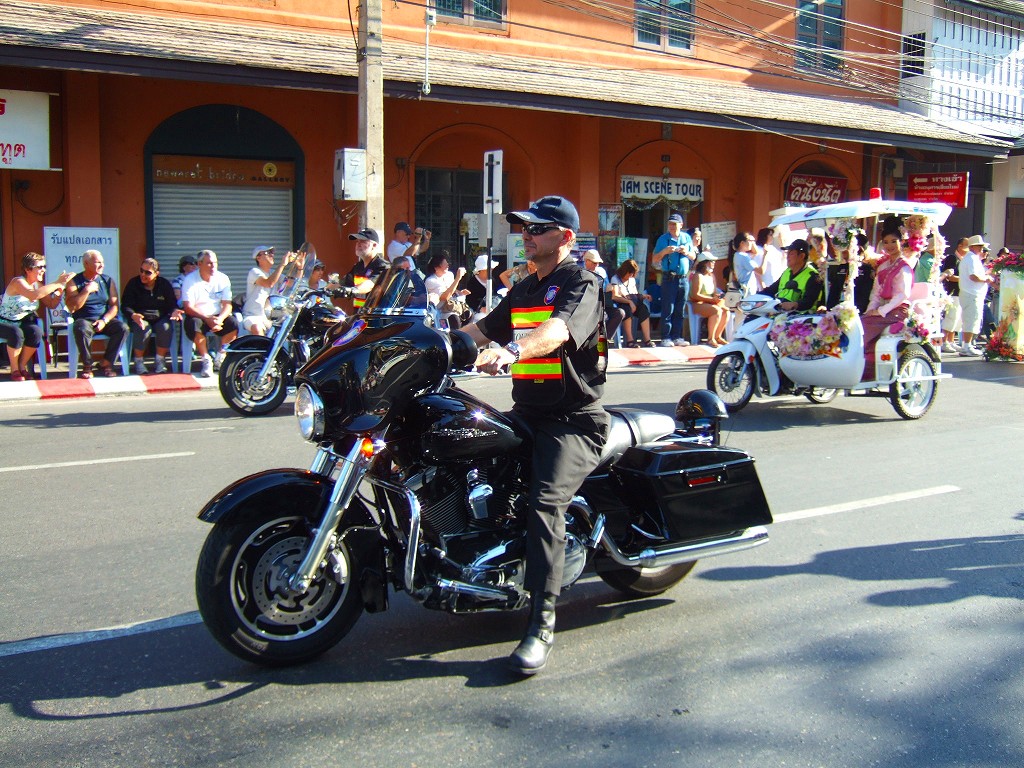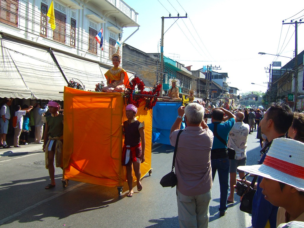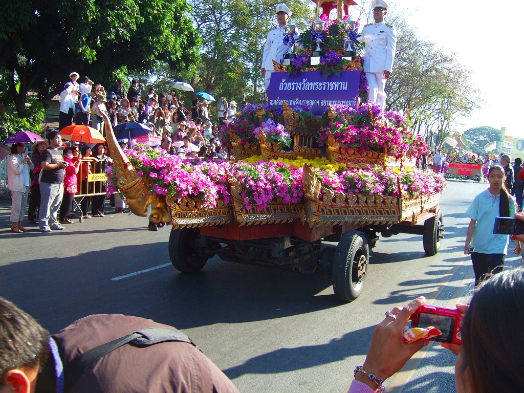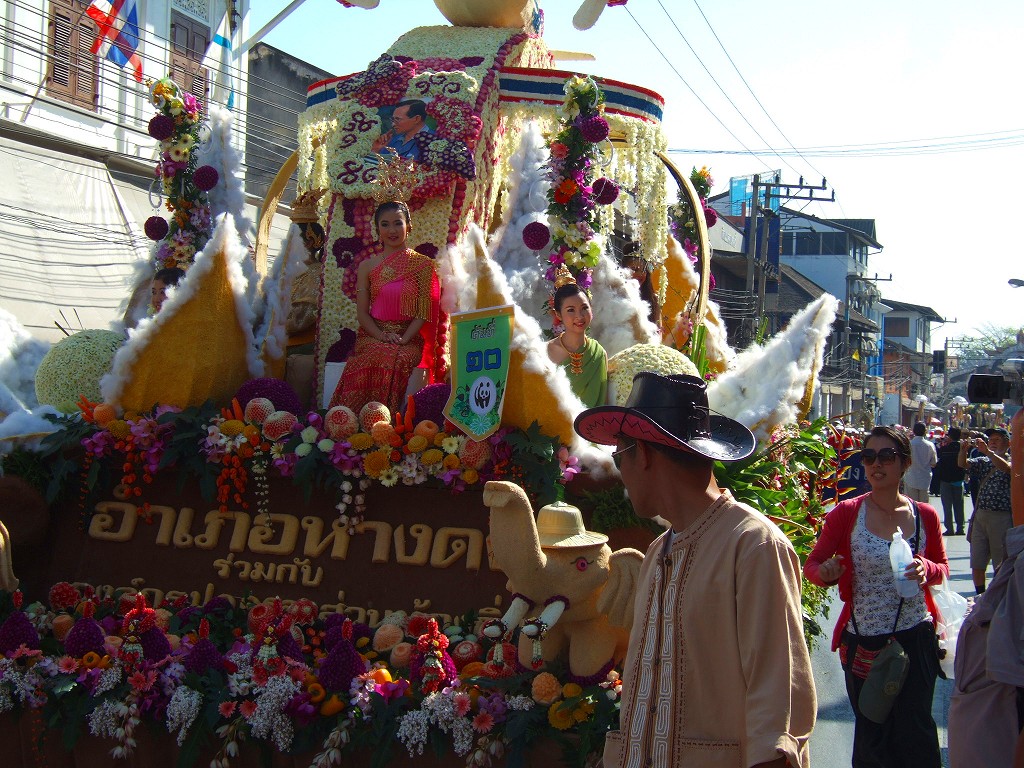 マスコットやサイドカーにミスチェンマイが乗ってパレードが始まる。最初の山車は軍関係か王室の関系のようです。