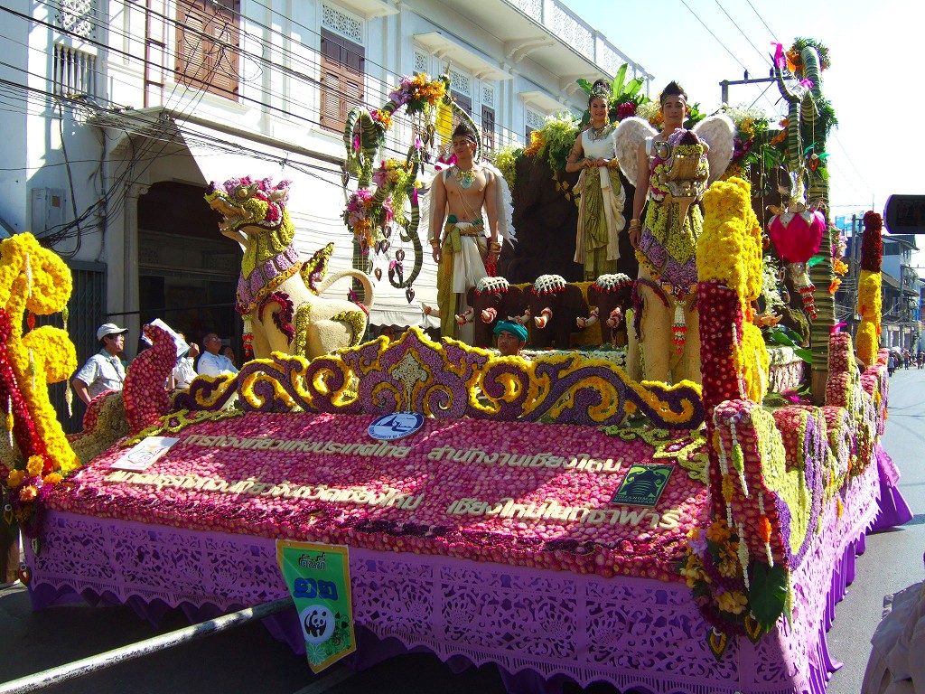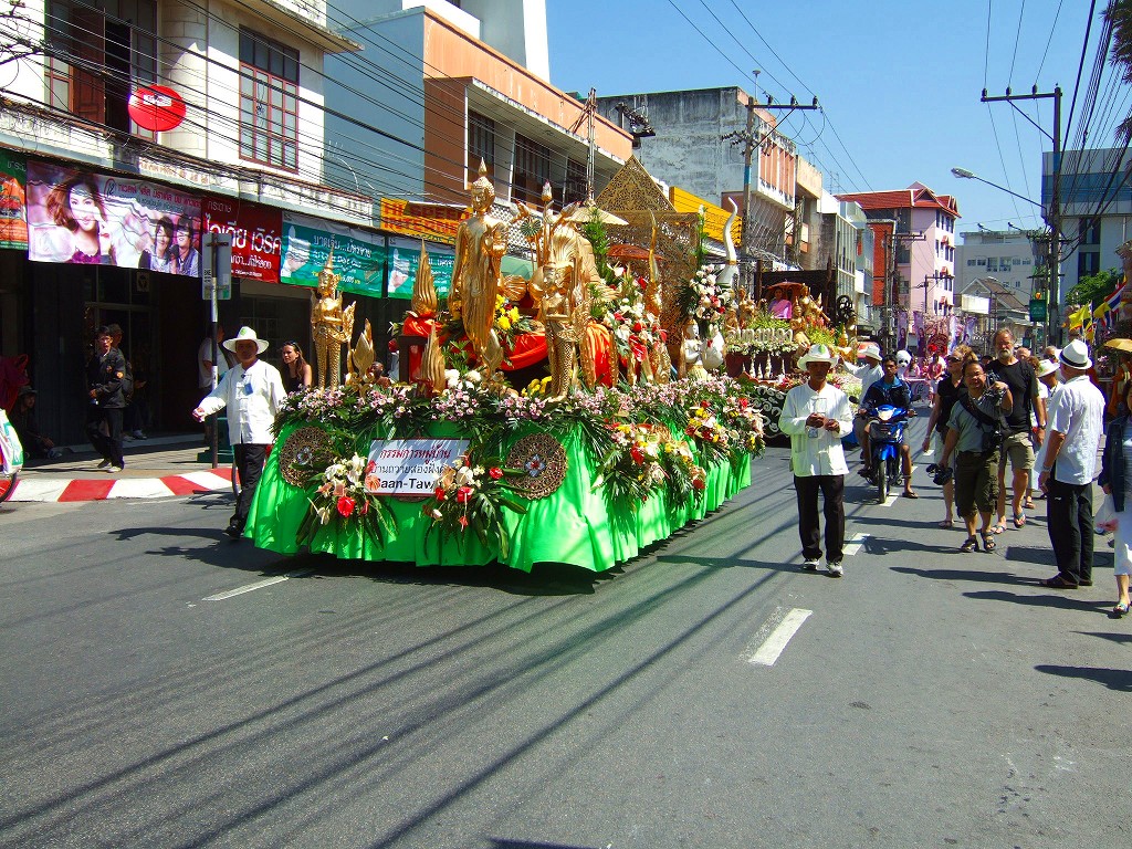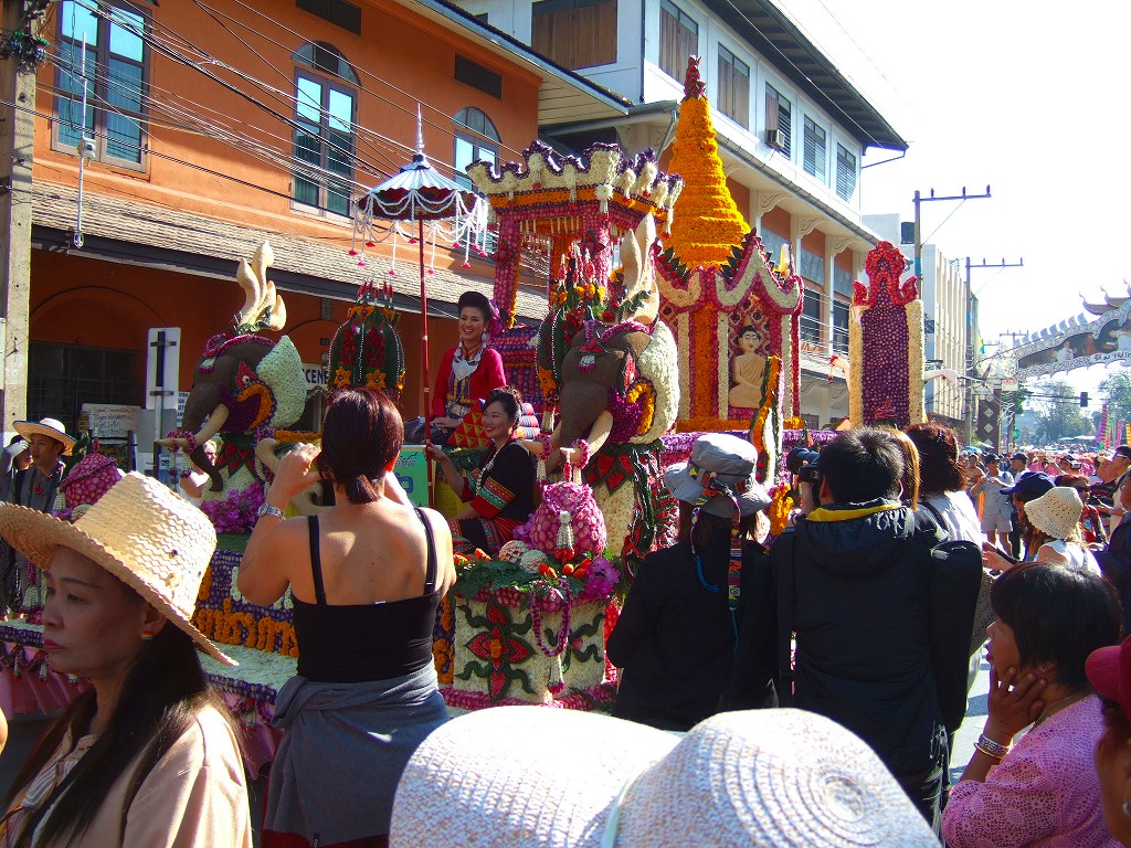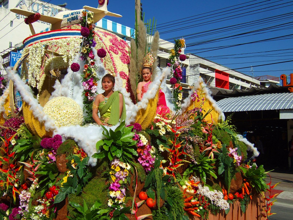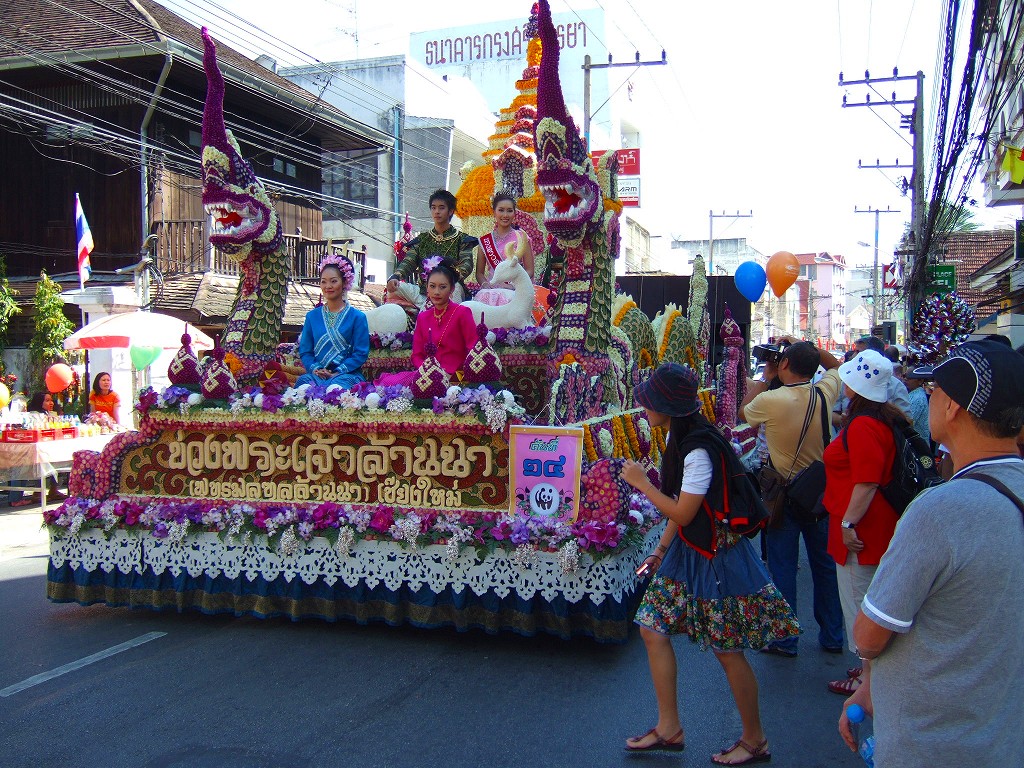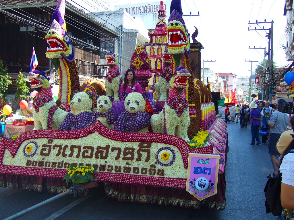 マスコットやサイドカーにミスチェンマイが乗ってパレードが始まる。最初の山車は軍関係か王室の関系のようです。