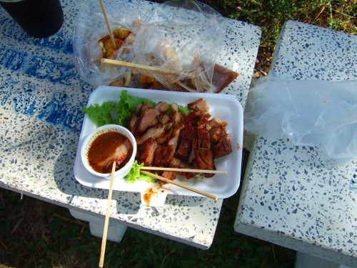 昼に食べた豚肉の炭焼きが美味かったので、夕食も同じ物を食べる。一人前で40バーツだったような。
