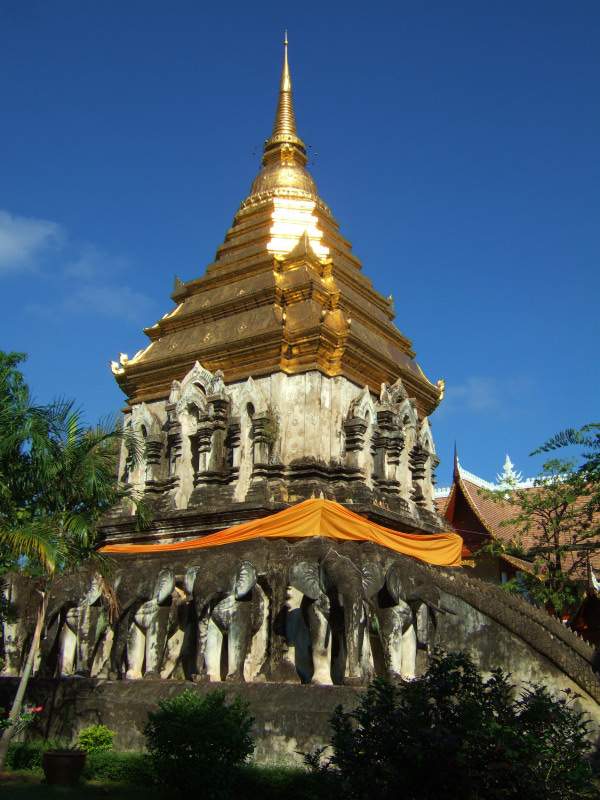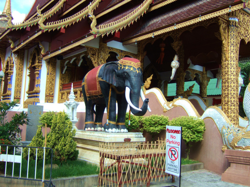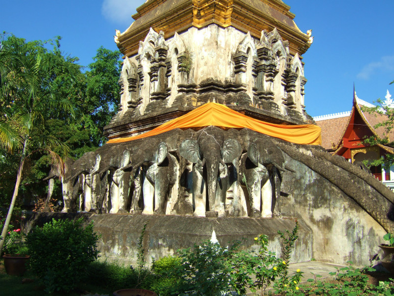 市内でまだ見ていない寺、ワットチェンマンへ見物に出かける。旧市内の東北方向で場所が判らないのでソンテオで行く。庭園が広く色々な花が見れました。仏塔は象が支えているように作られております。
