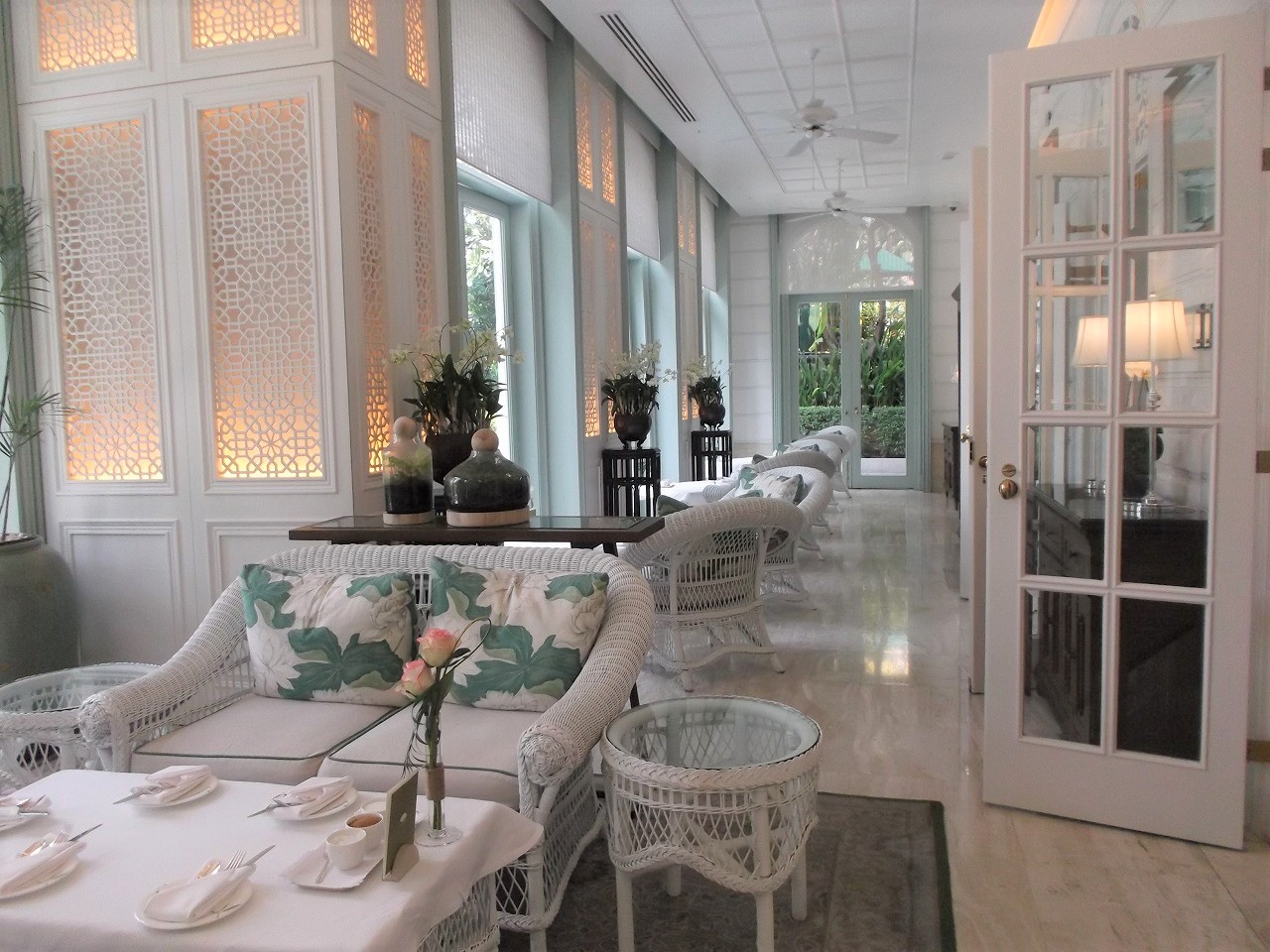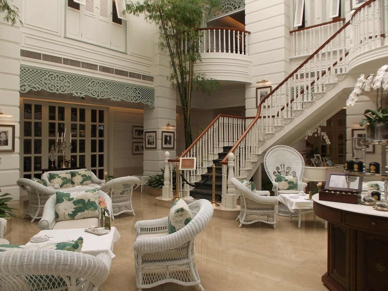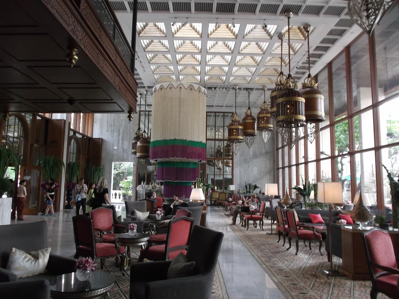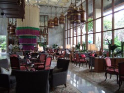 勿論陸から入る入口が正式のロビーですが、川側の桟橋からも直結しており、三島由紀夫が暁の寺を執筆するために利用したことやサマセットモームが著作のために利用した場所として有名ですが、訪れるのは初めて。黒服ネクタイのフロントマンに桟橋で迎えられて満足するもオーサーズラウンジでのアフタヌーンティーは一人5,000円以上で随分と高い(*_*♪。