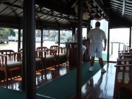 腸はホテル近くの船をかたどった寺院 ワットヤンナワー を散策し、チャオプラヤー川に張り出して作られた東屋で、魚に餌やリをしました。