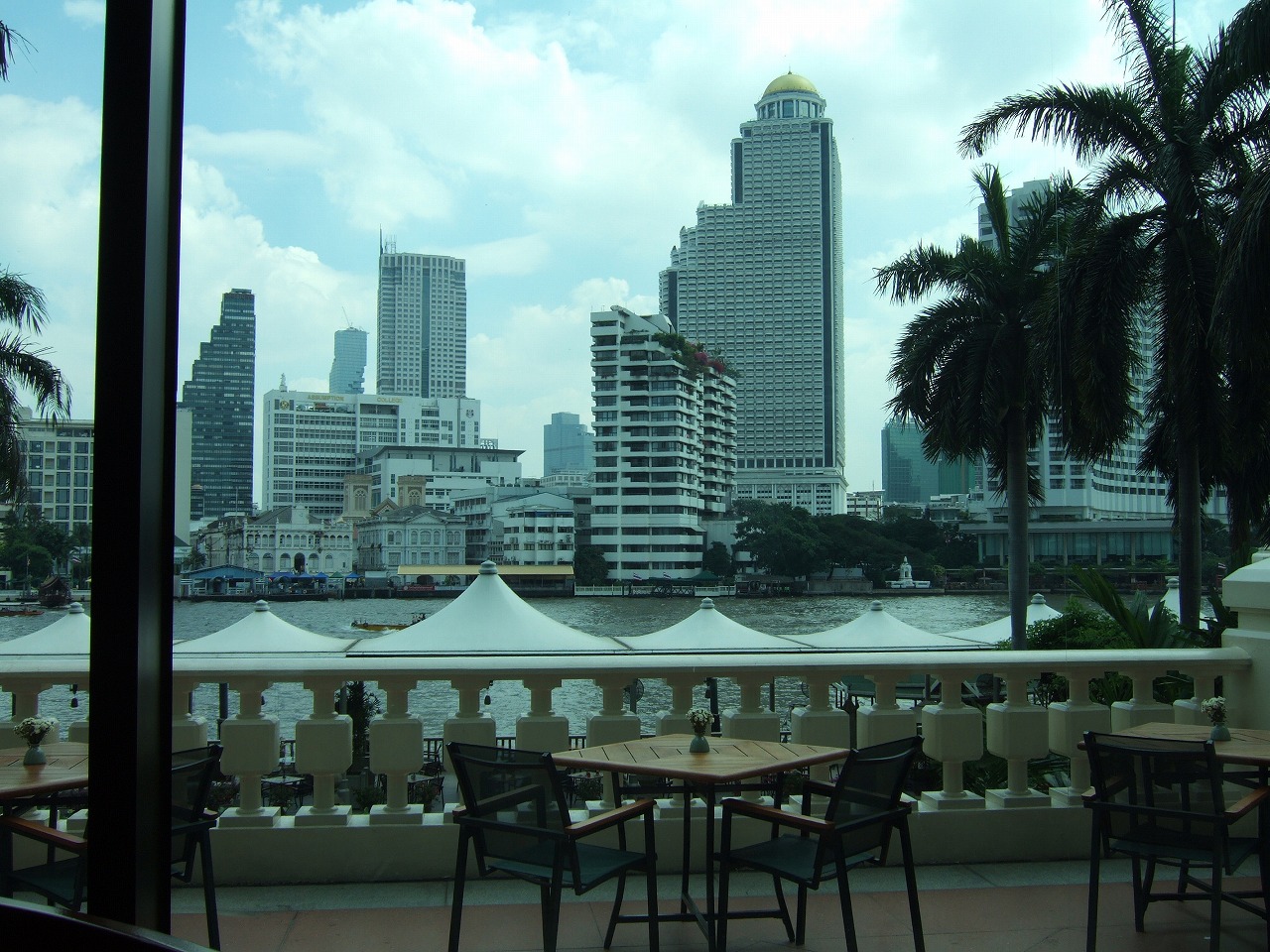 ロビーカフェの窓際席に座りましたが、こちらは窓の外にあるテラス席を透かして川の様子や対岸の風景が良く見えます。マンダリンオリエンタルも真正面。オリエンタルのオーサーズラウンジは庭園が大きく植え込みも多いので川はあまり見えないのと比べて違いがあります。