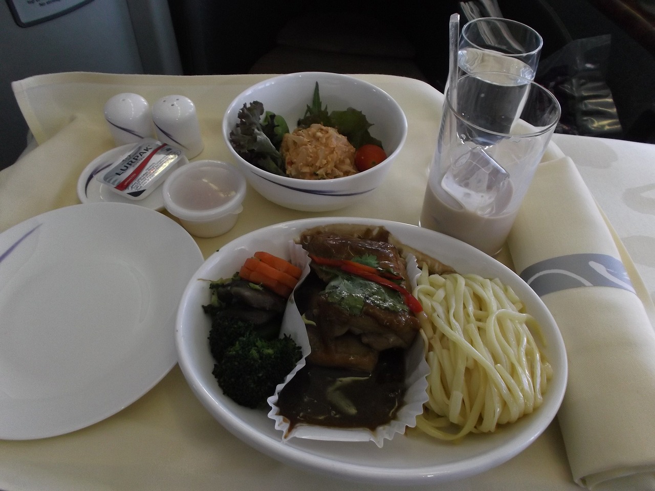 空港の中華航空ラウンジでは食べ物は少なかったのでお茶とスナックですごす。飛行機の中ですぐに食事が出るのであまり食べないのが良い。 フライトはファーストクラスの座席が宛がわれて往路と合わせて今回は非常にラッキーでした。ビジネス席でも十分広いのですが、ファーストクラスはまた特別です。