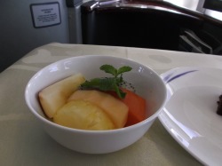 | 機内食のデザート フルーツとケーキ |