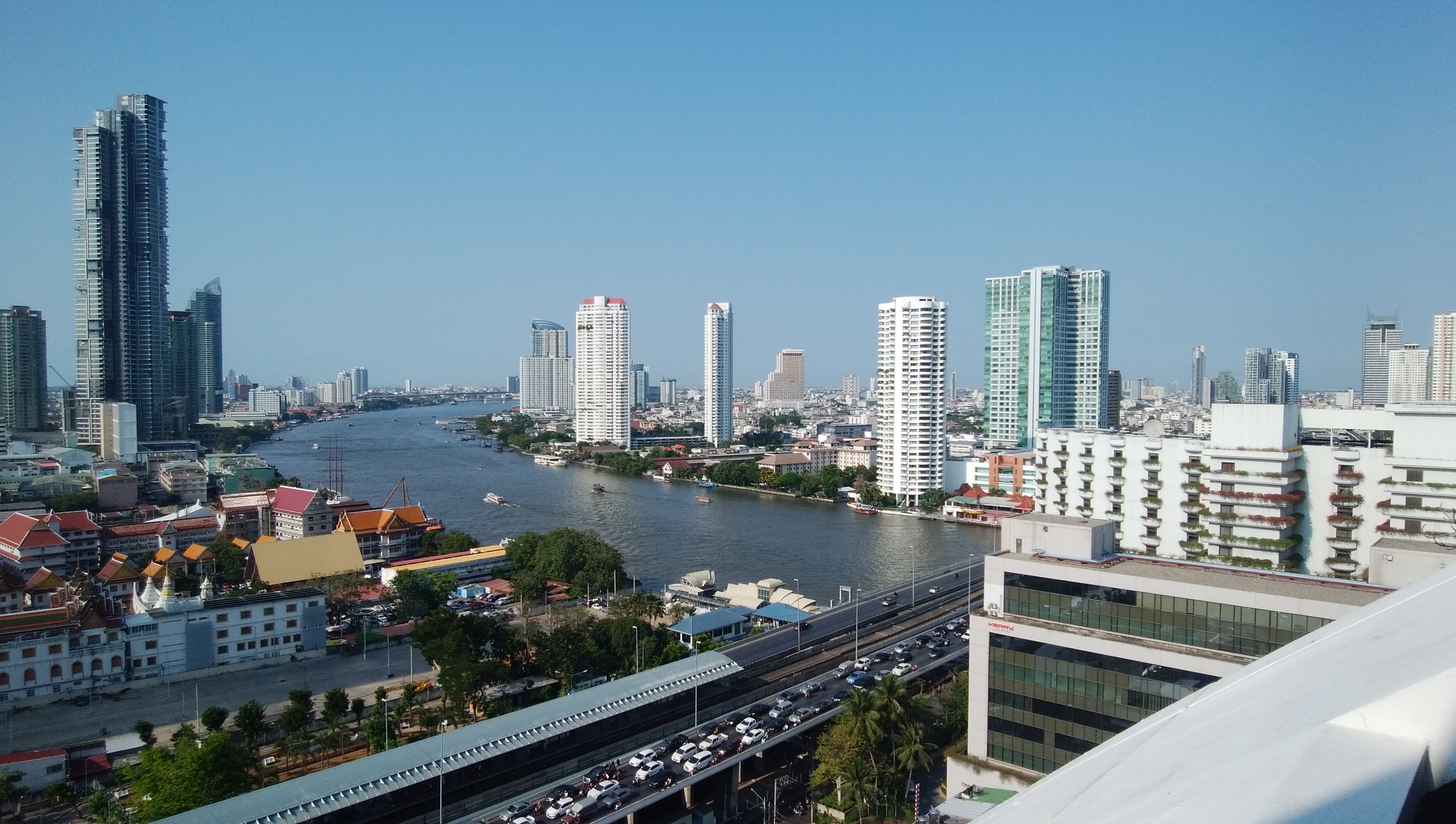 雄大なチャオプラヤー河と朝日に映えるホテル群、すぐ下はタクシン橋を通る鉄道の停留所と通勤ラッシュで混雑する自動車道です。