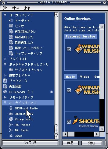 | 3.メディアライブラリーの左メニューからオンラインサービスを探し、直ぐ左に有る右向きの三角アイコンをクリックする | |