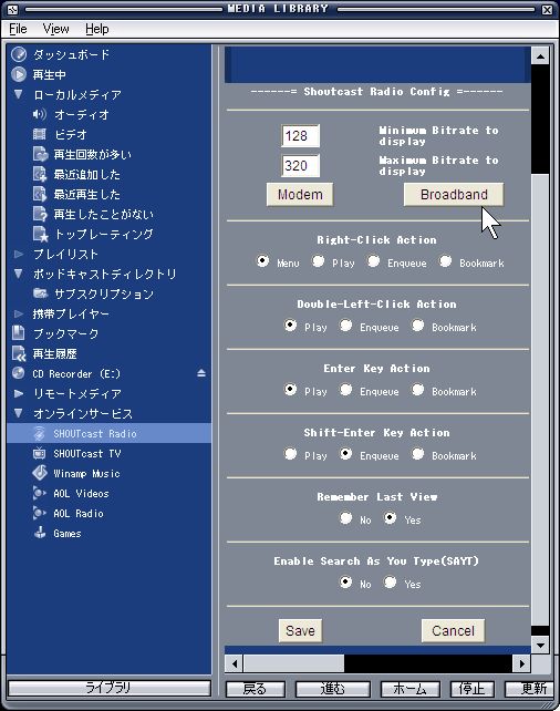 | 6.右図がでるので、先ず「Broadband」をクリック、次いで「Minimum/Maximum Bitrate」を設定する。 128 320ぐらいが適当。 後は右のように合わせて置いてください。 これで高音質の放送だけをリストアップしてくれます。 |