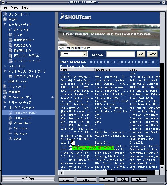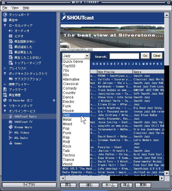 | 11.Jを頭文字にしたジャンルの一覧が出ますので、例えばJazzを選ぶと (同じ要領でJapaneseを選ぶと日本でShoutCast放送に参加している人の一覧が出ます。これはShoutCastを利用したインターネットラジオの設定で「Make this server public」と言う項目にチェックを入れた人が参加する放送です。) |
