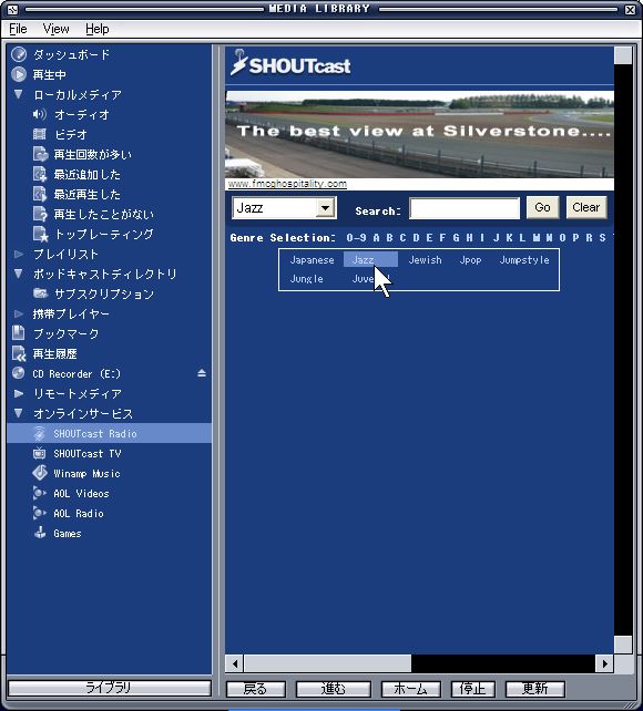 | 10.もう一つの選局方法は「Genre Selection」一覧から例えば「J」をクリックすると |