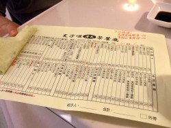台湾の飲茶はワゴン式で好きなものを選んで取って食べると言う方式は少なく、3軒ほど飲茶の店へ行きましたがすべてメニューを見て注文する方式ですので、出てくる順はお店任せとなります。 |