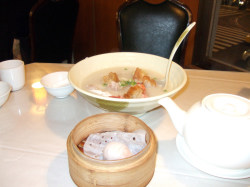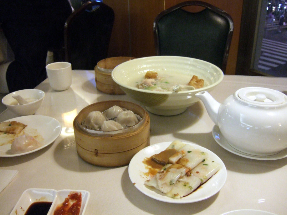 夕食は近くにある港式飲茶の店(香港式の意味らしい)へ行ってみました。ローカルな店で英語も日本語も通じませんでしたが、メニューの台湾式の漢字から適当に意味を想像しながら頼んでみました。蒸し物中心で蒸篭を2つ、他に一皿、海鮮お粥らしきもの1つ、さらにデザートとして杏仁豆腐のジュースみたいなものを頼んでしまいました。これは失敗、杏仁の文字に誘われて冷たい奴の心算で頼んだら氷と一緒にジューサーでかき回した奴でした^^;