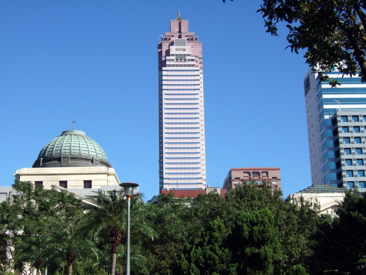 写真は公園から見える新光三越のビルと台湾国立博物館のドーム屋根です。 |