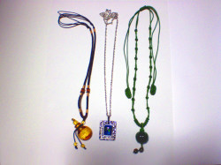 台湾ヒスイが右、中は琺瑯、左は琥珀に似せたガラス製の香水壺のネックレス。